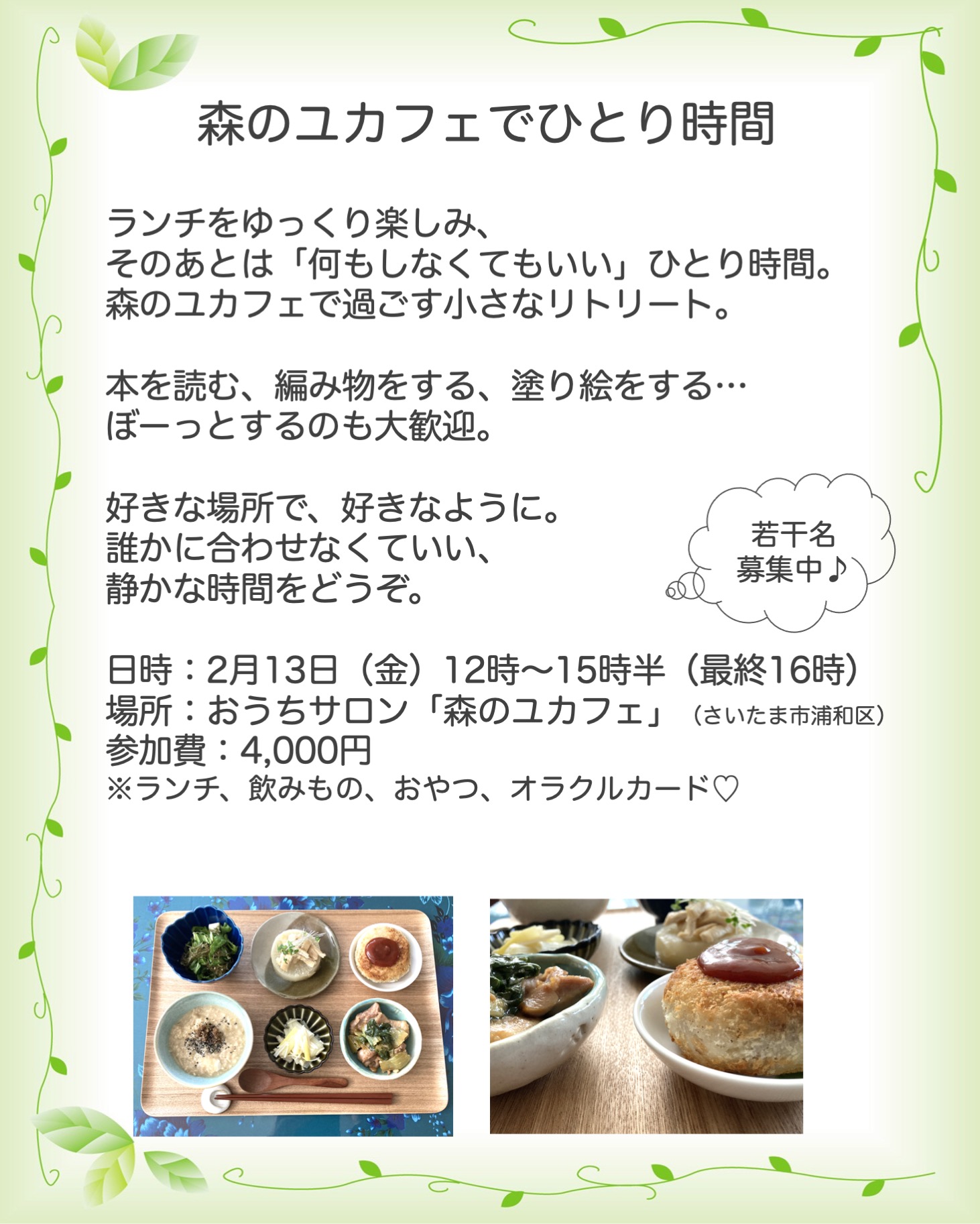 Home › スライド2 2026-02-03 スライド2 関連記事 ☆今後のスケジュールと新メニュー☆ 星の言葉カード講座とお茶会のご案内 森のユカフェ星詠みランチ会(3〜4名様のリクエスト開催) 森のユカフェの休み時間 〜星と料理でくつろぎのひととき〜 ☆スケジュールご案内☆(1月20日更新) ☆今後のスケジュールと新メニュー☆ コメントを残す コメントをキャンセルメールアドレスが公開されることはありません。 ※ が付いている欄は必須項目ですコメント ※ 名前 ※ メール ※ サイト Δ