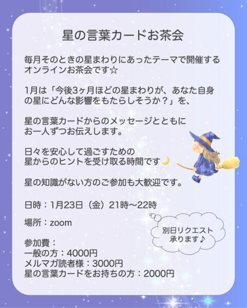 Home › スライド3 2026-02-03 スライド3 関連記事 ☆今後のスケジュールと新メニュー☆ 星の言葉カード講座とお茶会のご案内 森のユカフェ星詠みランチ会(3〜4名様のリクエスト開催) 森のユカフェの休み時間 〜星と料理でくつろぎのひととき〜 ☆スケジュールご案内☆(1月20日更新) ☆今後のスケジュールと新メニュー☆ コメントを残す コメントをキャンセルメールアドレスが公開されることはありません。 ※ が付いている欄は必須項目ですコメント ※ 名前 ※ メール ※ サイト Δ