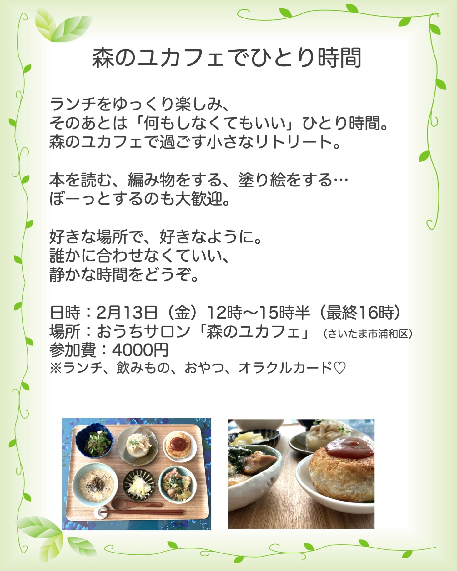 Home › スライド5 2026-02-03 スライド5 関連記事 ☆今後のスケジュールと新メニュー☆ 星の言葉カード講座とお茶会のご案内 森のユカフェ星詠みランチ会(3〜4名様のリクエスト開催) 森のユカフェの休み時間 〜星と料理でくつろぎのひととき〜 ☆スケジュールご案内☆(1月20日更新) ☆今後のスケジュールと新メニュー☆ コメントを残す コメントをキャンセルメールアドレスが公開されることはありません。 ※ が付いている欄は必須項目ですコメント ※ 名前 ※ メール ※ サイト Δ